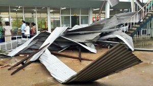 In de buurt zijn twee scholen en daar zou de schade enorm zijn. We rijden een paar straten verder en zien bij het Miranda College een geweldige ravage. Het is een grote school, gebouwd in een U-vorm met een binnenplein en twee etages hoog. Werkelijk het hele dak van de school is weg. De golfplaten van het dak liggen in de omtrek verspreid, of de grijze gekreukelde platen hangen in de bomen. De binnenplaats van de school is een ravage van scherven, metalen voorwerpen en restanten van het dak. Een plaat van het dak is op enkele geparkeerde auto’s terechtgekomen. De deur van de bibliotheek staat open en ik kijk naar binnen. Hier binnen is een deel van het plafond naar beneden gekomen. Door de gaten in het dak en de hevige regenval is het interieur met de keurige boekenstellingen nat. Ter plekke is direct de Districts Commandant Jerry Miranda (de burgemeester) en hij geeft voor de camera een korte toelichting. Hij begint te zeggen: “ik hoop dat u niet gaat vragen hoe groot de schade is”.
